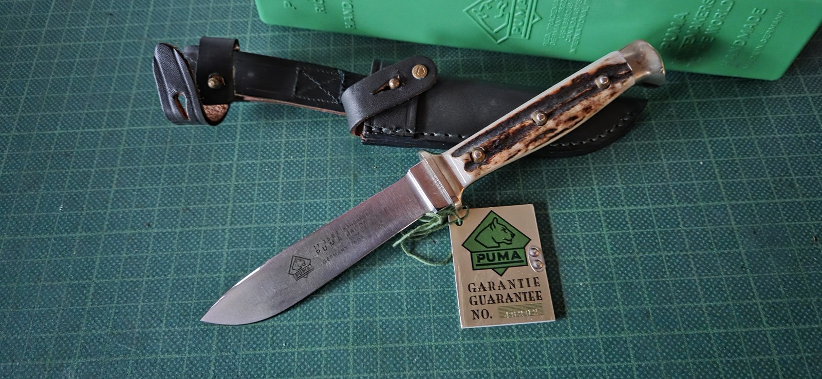neuwertig, in gelb-grüner Box, #48292, Garantiekarte, Neusilberbacken, Horn, Lederscheide, Klinge 10,3cm, Griff 9,8cm