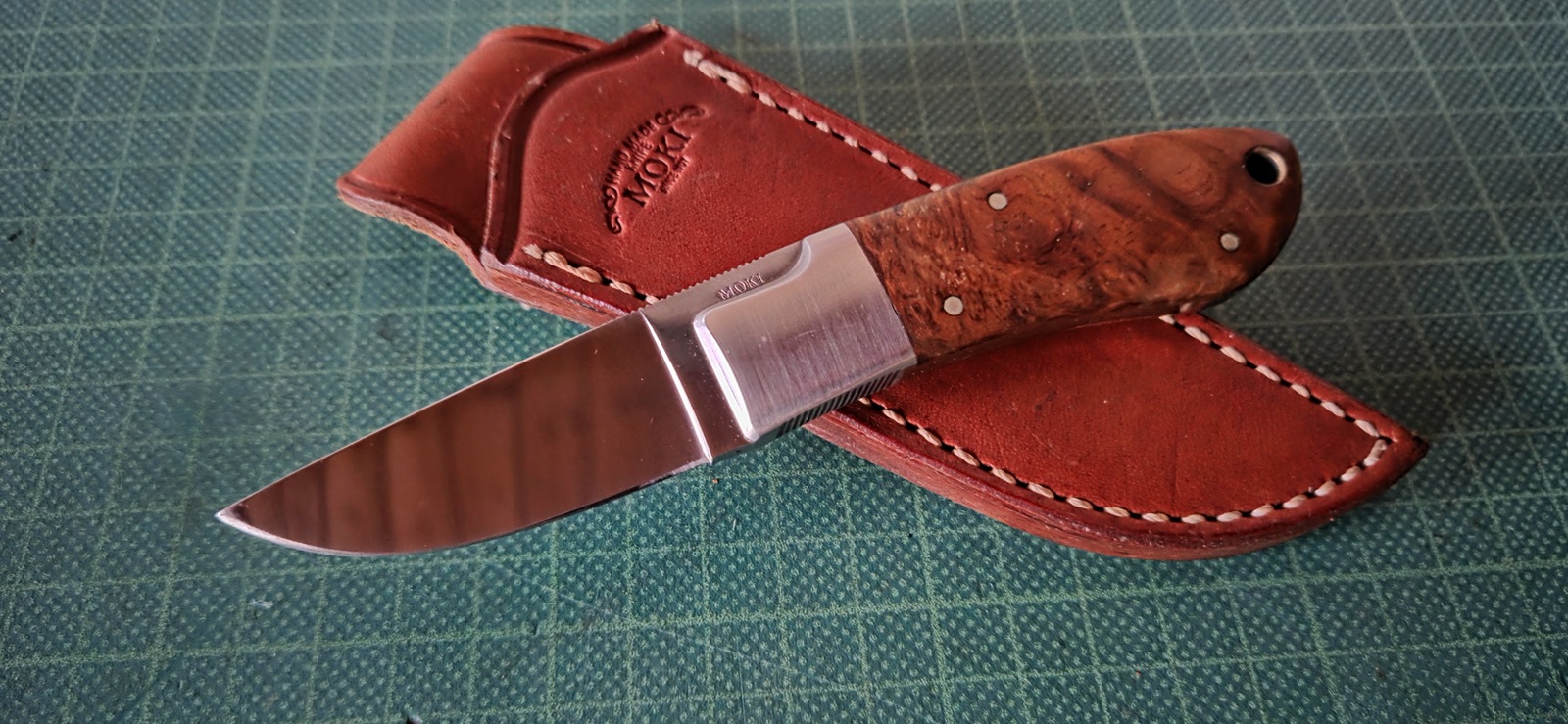 getragen, ATS34, poliert, Edelstahlbacken, Wurzelholzschalen, Lederscheide, Klinge 6cm, Griff 8,8cm