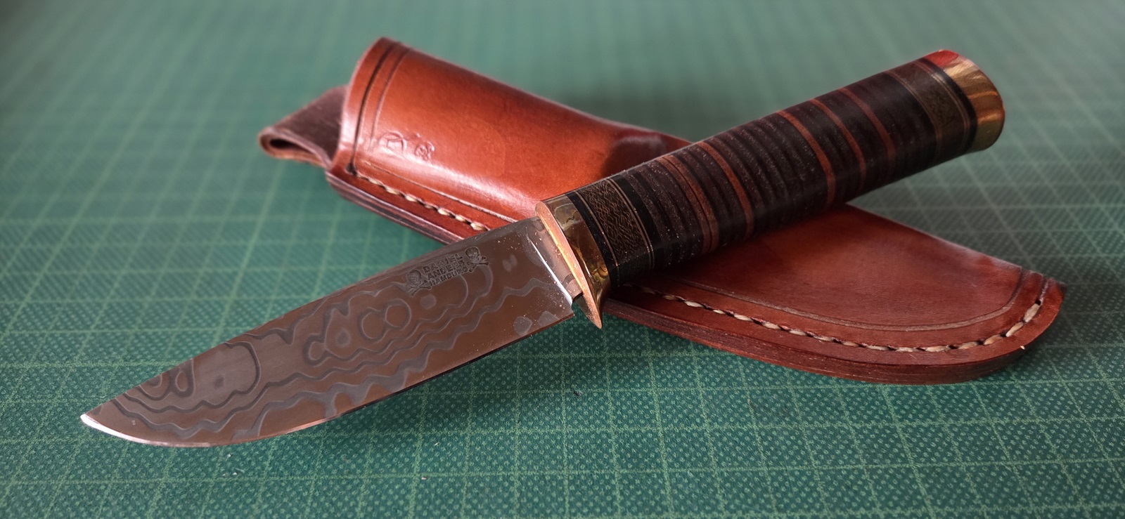 neuwertig, rostfreier Balbach-Damast, Kupfer, Ledergriff, Lederscheide, Klinge 9,8cm, Griff 11,1cm