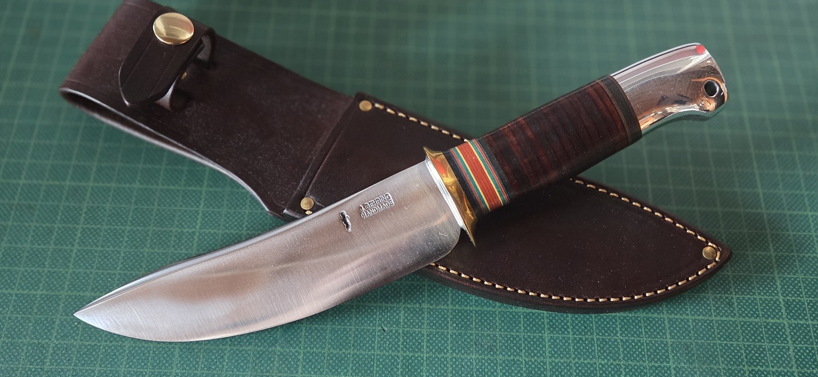 neuwertig, Böhler N690, stab. stockige Buche (grün), Edelsahlpins, Lederscheide, Klinge 8,9cm, Griff 9,5cm