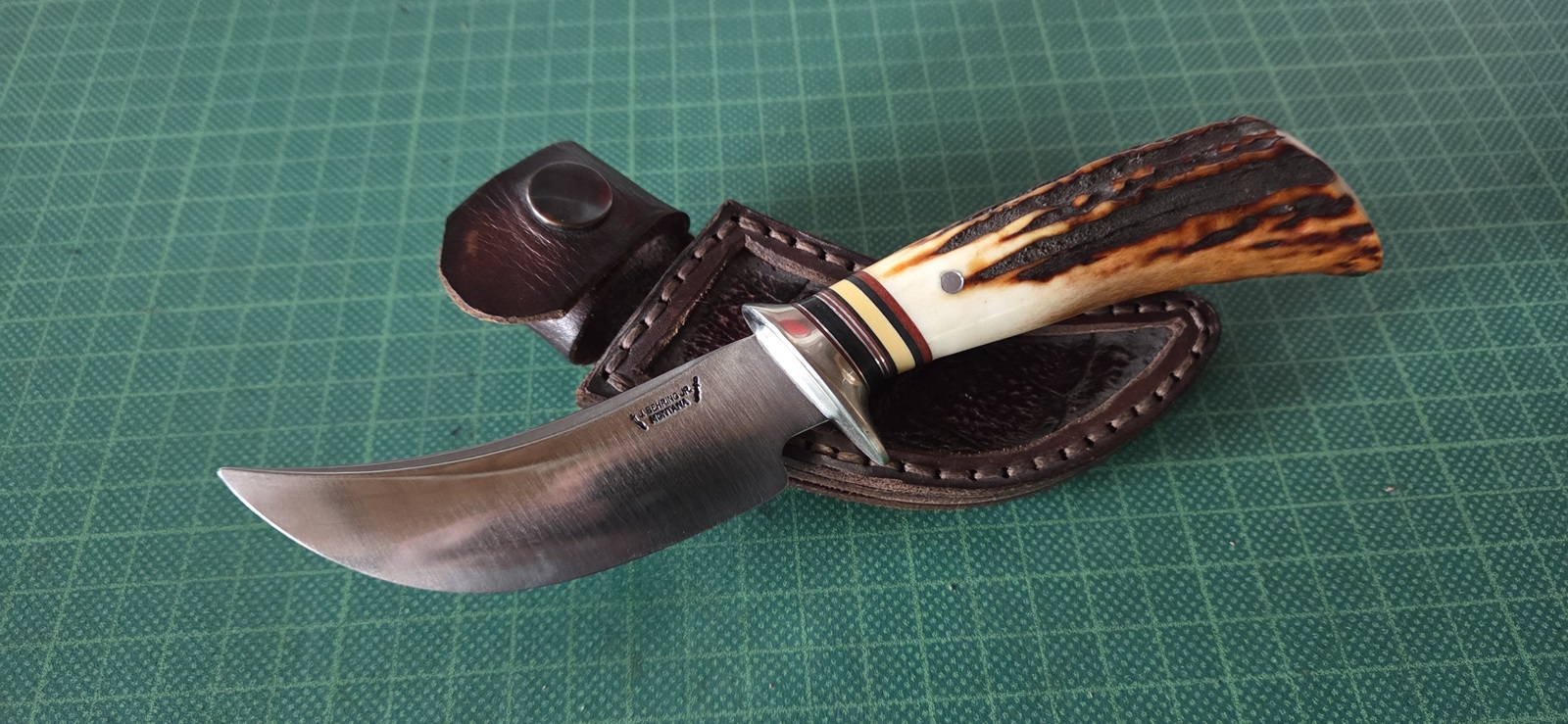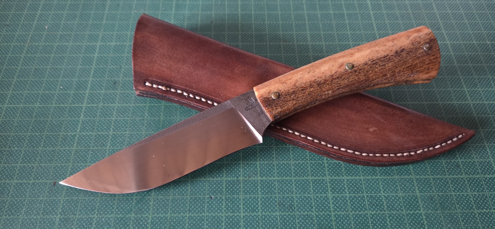 neuwertig, 440C, poliert, getapert, Sambar-Horn, Lederscheide, Klinge 9,6cm, Griff 9,8cm
