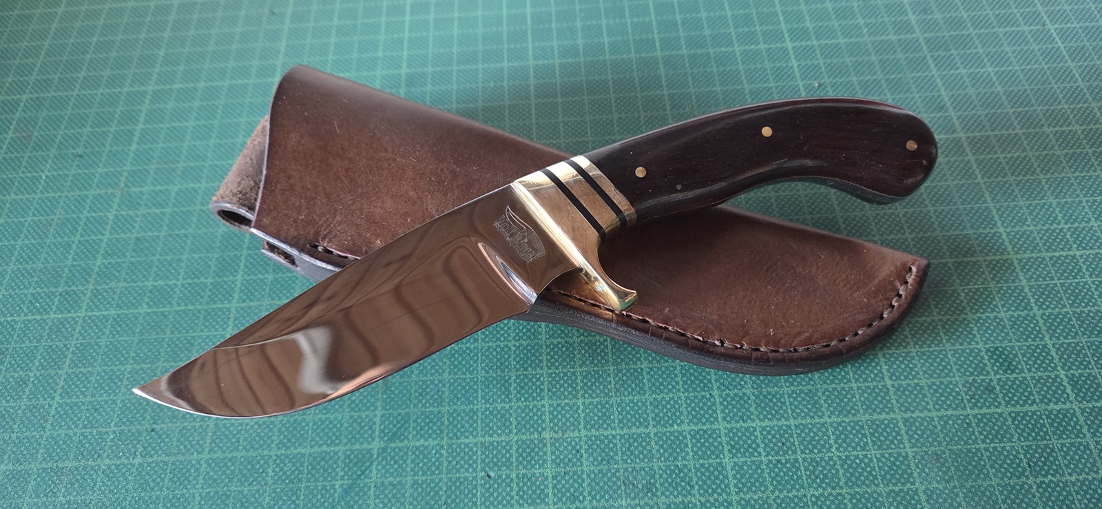 neuwertig, 440B, poliert, Messingguard, Holzschalen, Lederscheide, Klinge 11,6cm, Griff 11,5cm