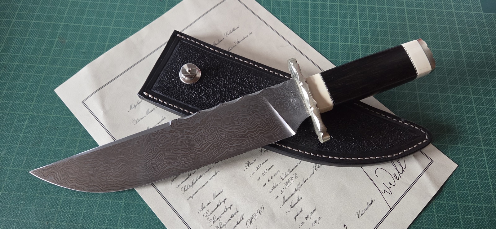 neuwertig, Nickeldamast von Gerhard Schedel, Neusilber, Mammut und Ebenholz, Lederscheide, Klinge 23,6cm, Griff 11,2cm