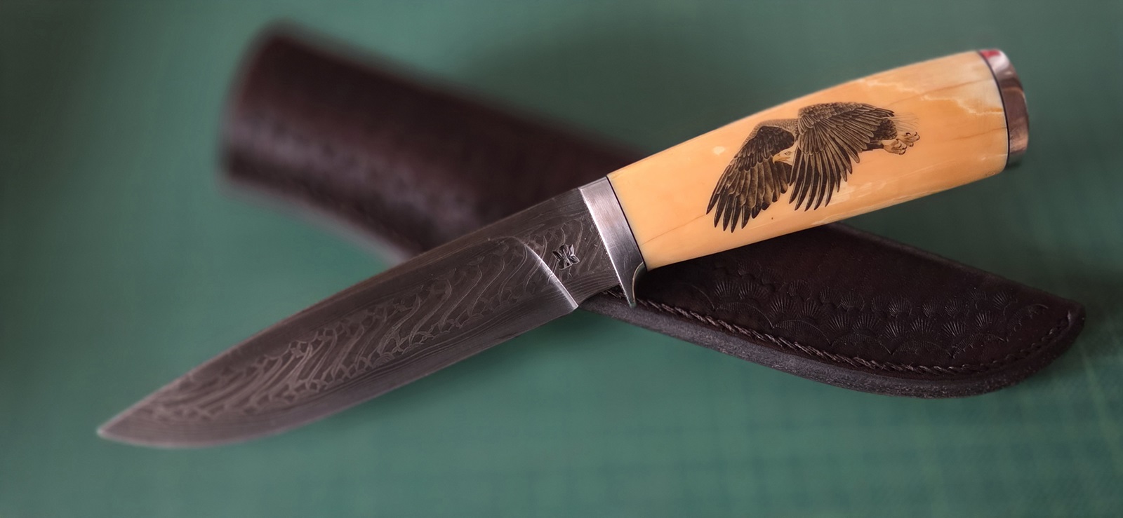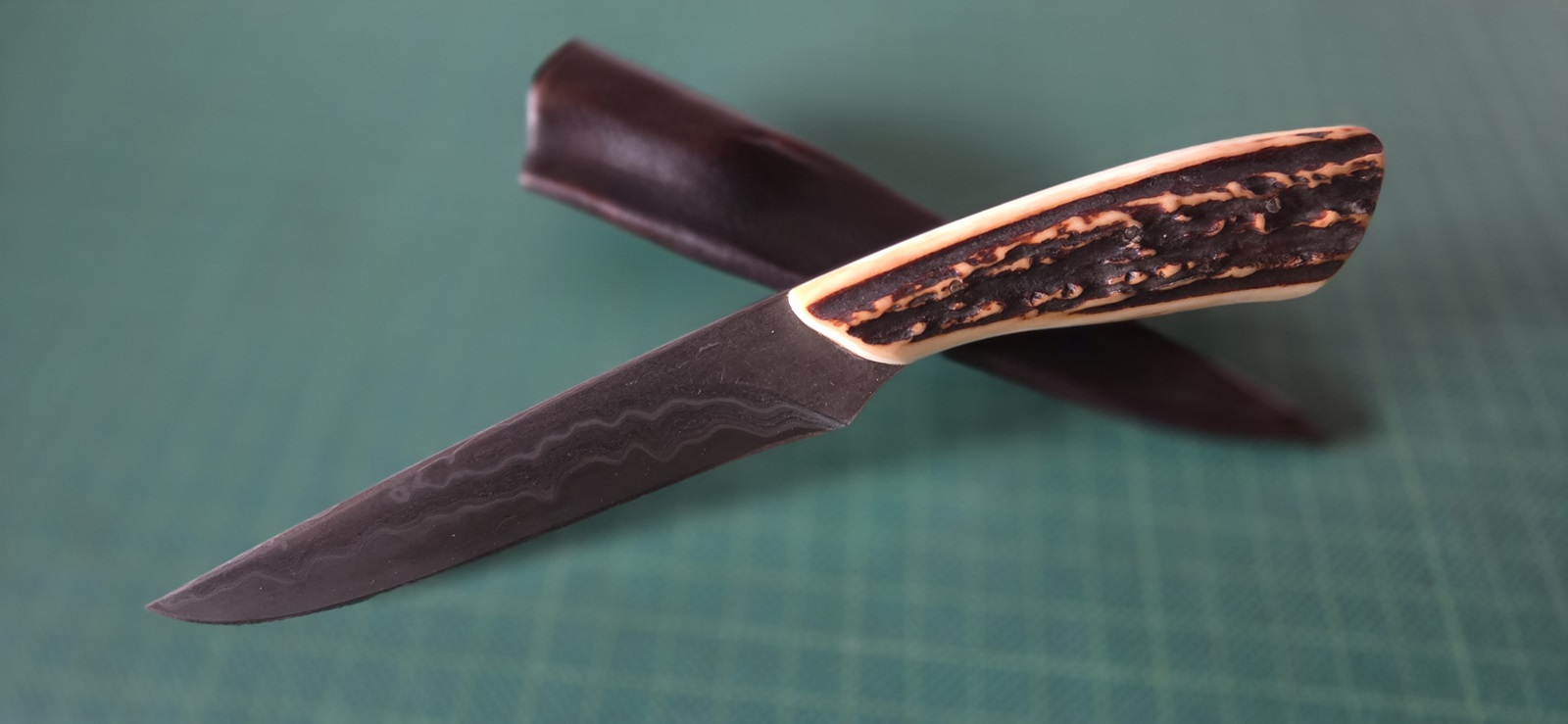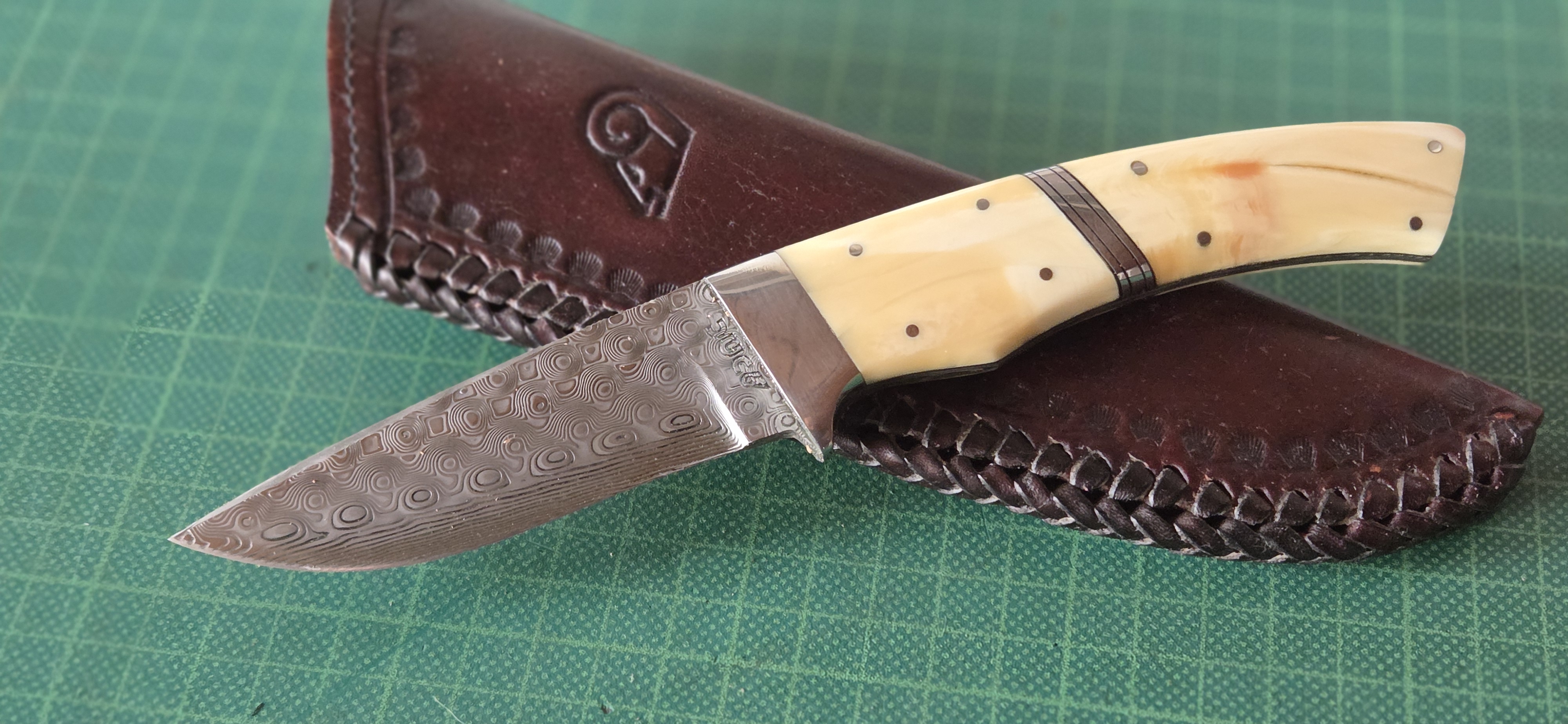 neuwertig, Damast, Edelstahlmonturen, Elfenbeinmicarta, schwarzes Fiber, Lederscheide, Klinge 9,3cm, Griff 10cm