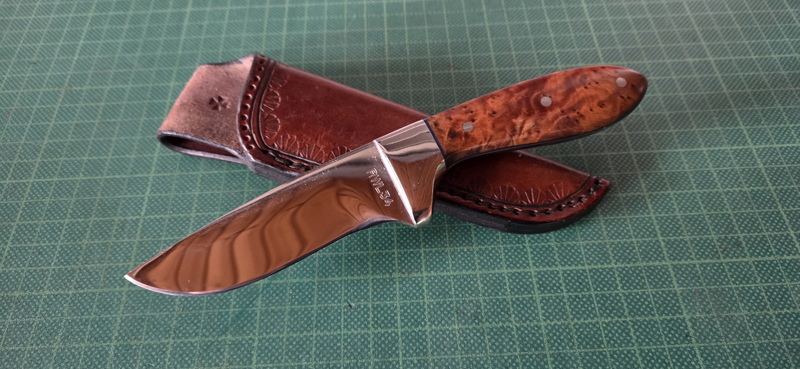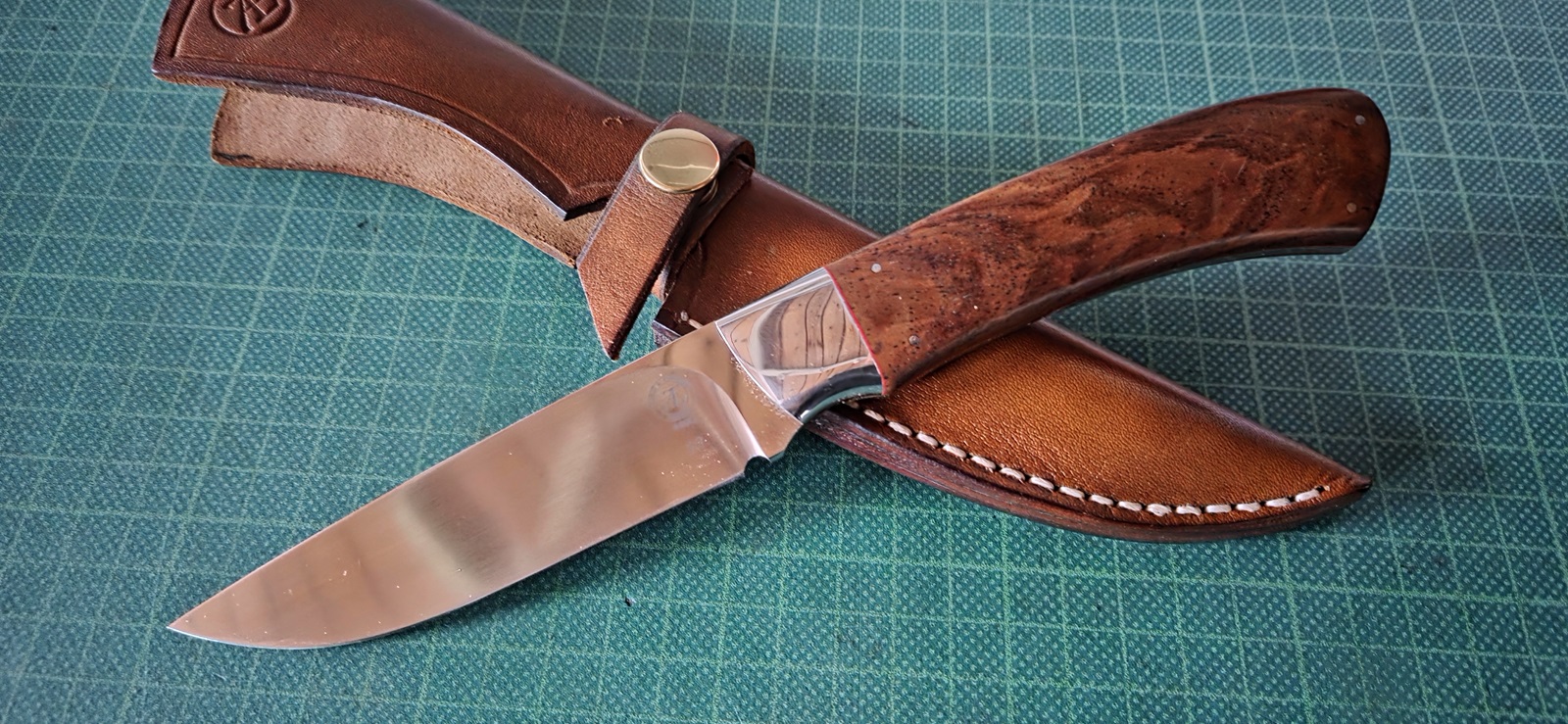 getragen, 1.3505, Maserbirke, Lederscheide mit Holzkern, Klinge 11,6cm, Griff 11,8cm