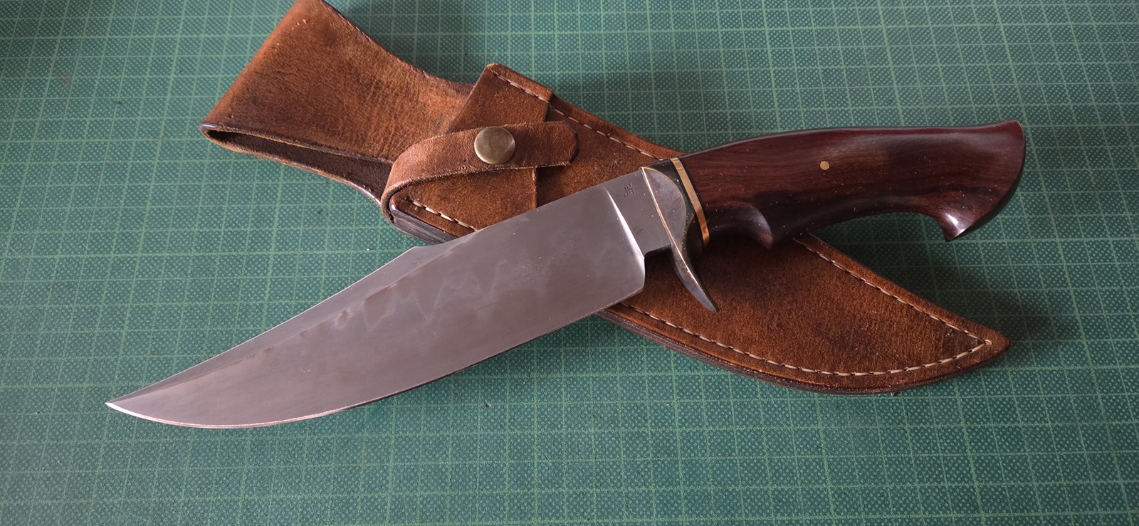 gebraucht, D2, gestrahlt, Schneide poliert, Holzschalen, Lederscheide, Klinge 10,2cm, Griff 9cm