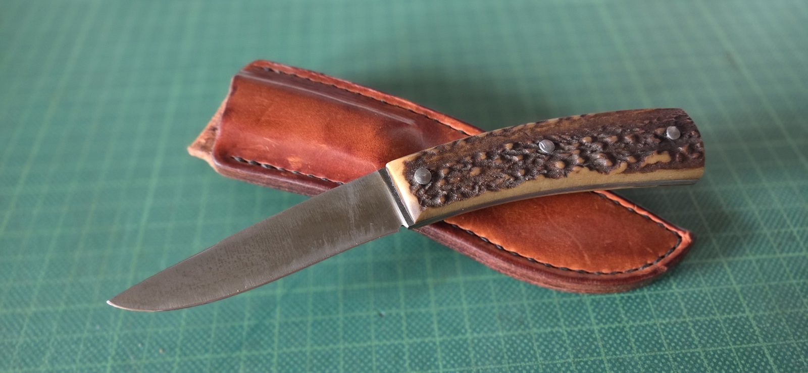 getragen, 102Cr6, Hirschhorn, Lederscheide, Klinge 8,8cm, Griff 10cm