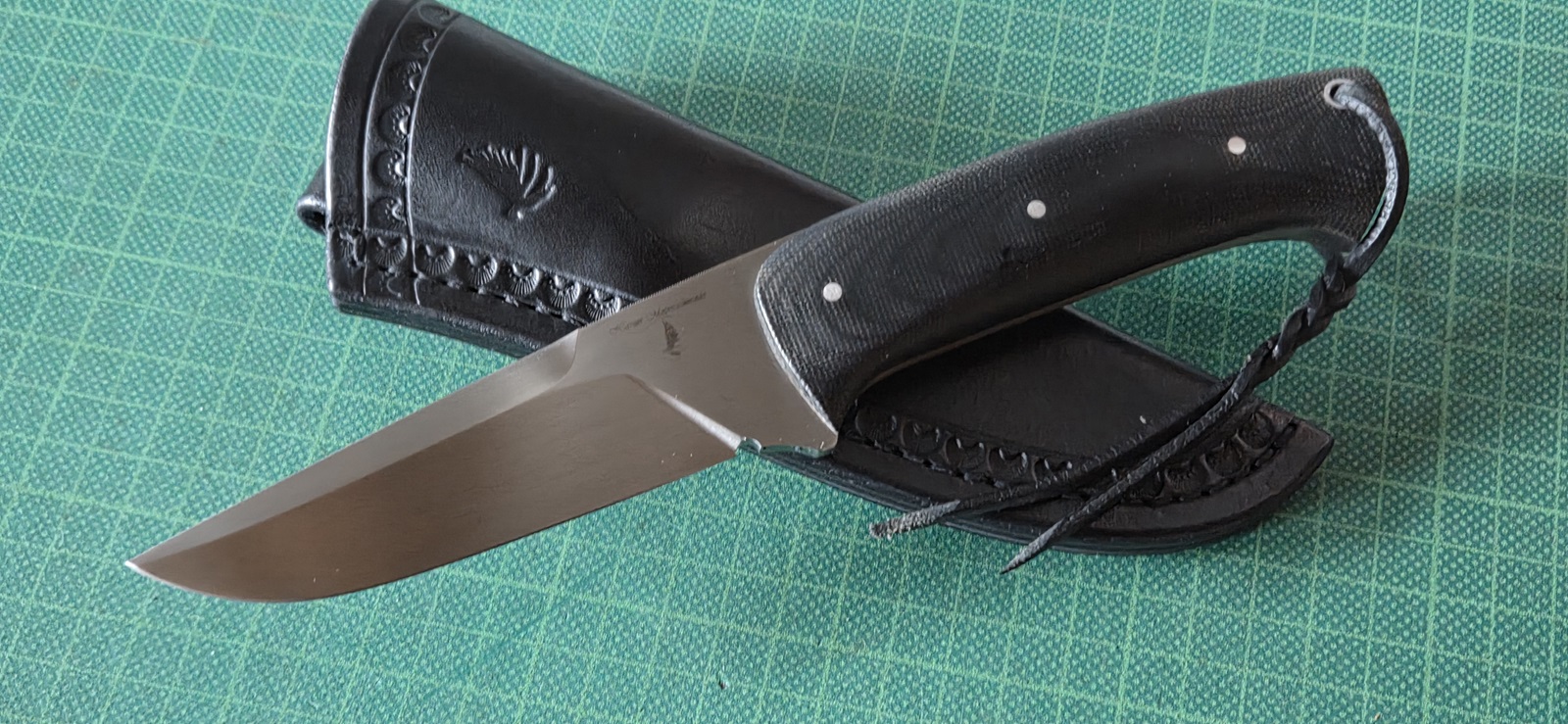 neuwertig, Böhler N690, geschwärzt, Micartaschalen, Lederscheide, Klinge 11,6cm, Griff 12,4cm