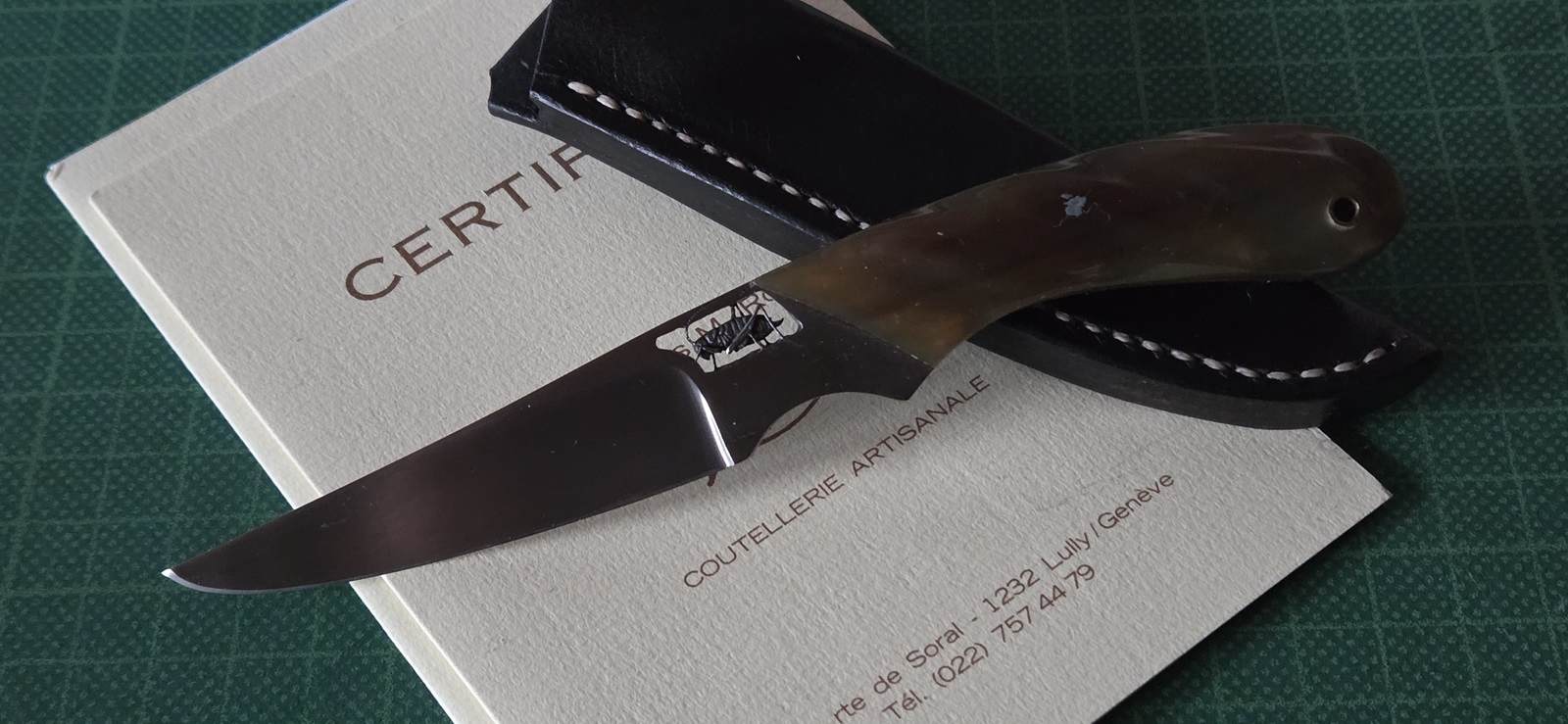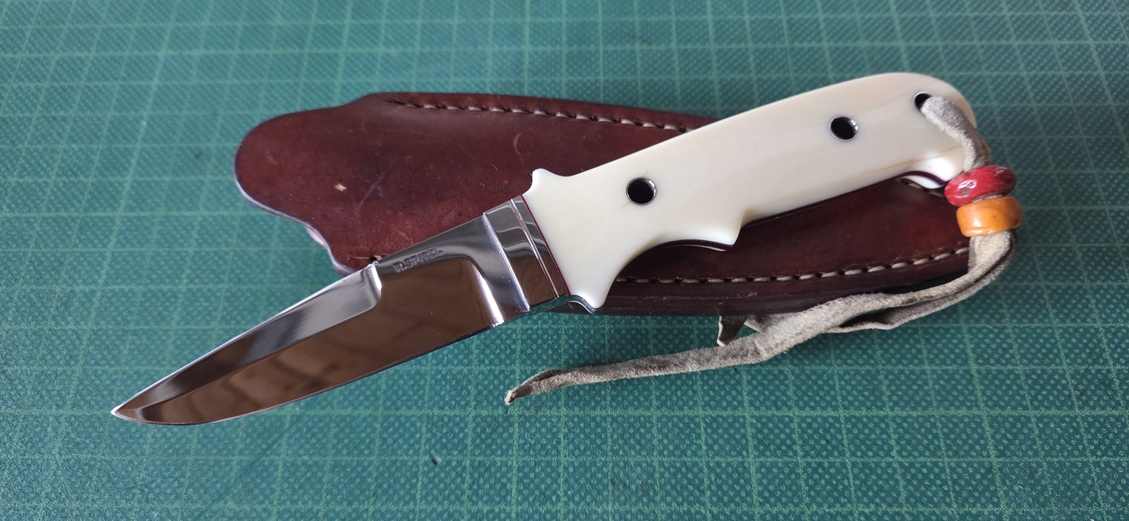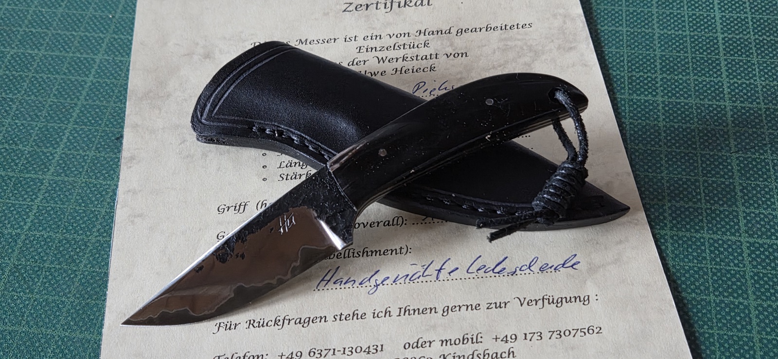getragen, RWL, poliert, Edelstahlbacken, Horn, Rücken scharf, Lederscheide, Klinge 8cm, Griff 10,4cm