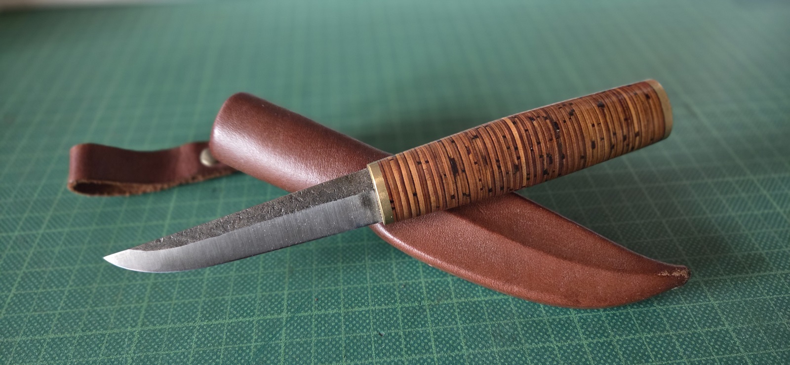 getragen, 1.3505, Messingmonturen, Birkenrindengriff, Lederscheide, Klinge 9,6cm, Griff 10,8cm