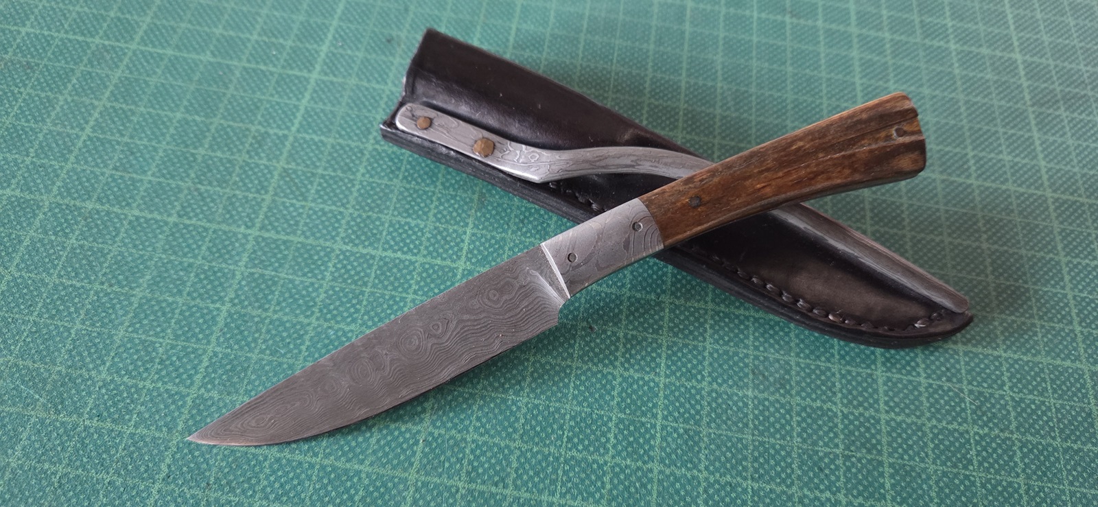 Messer I: 6-bahniger türkischer Damast, Flacherl, Neusilber, Grenadill, Klinge 10cm, Griff 11,1cm