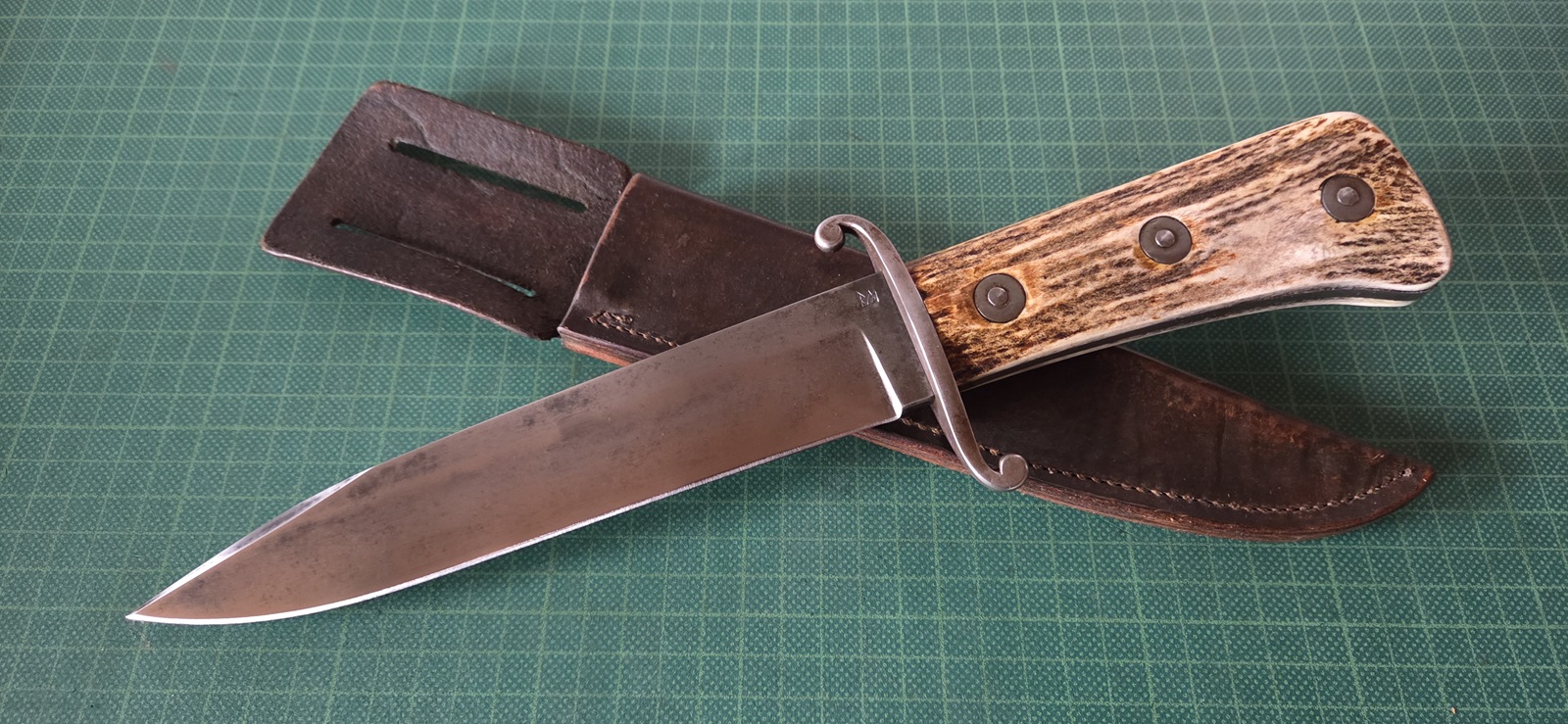 neuwertig, rostend, Stahlguard, Horn, Lederscheide, Klinge 20,1cm, Griff 13,5cm