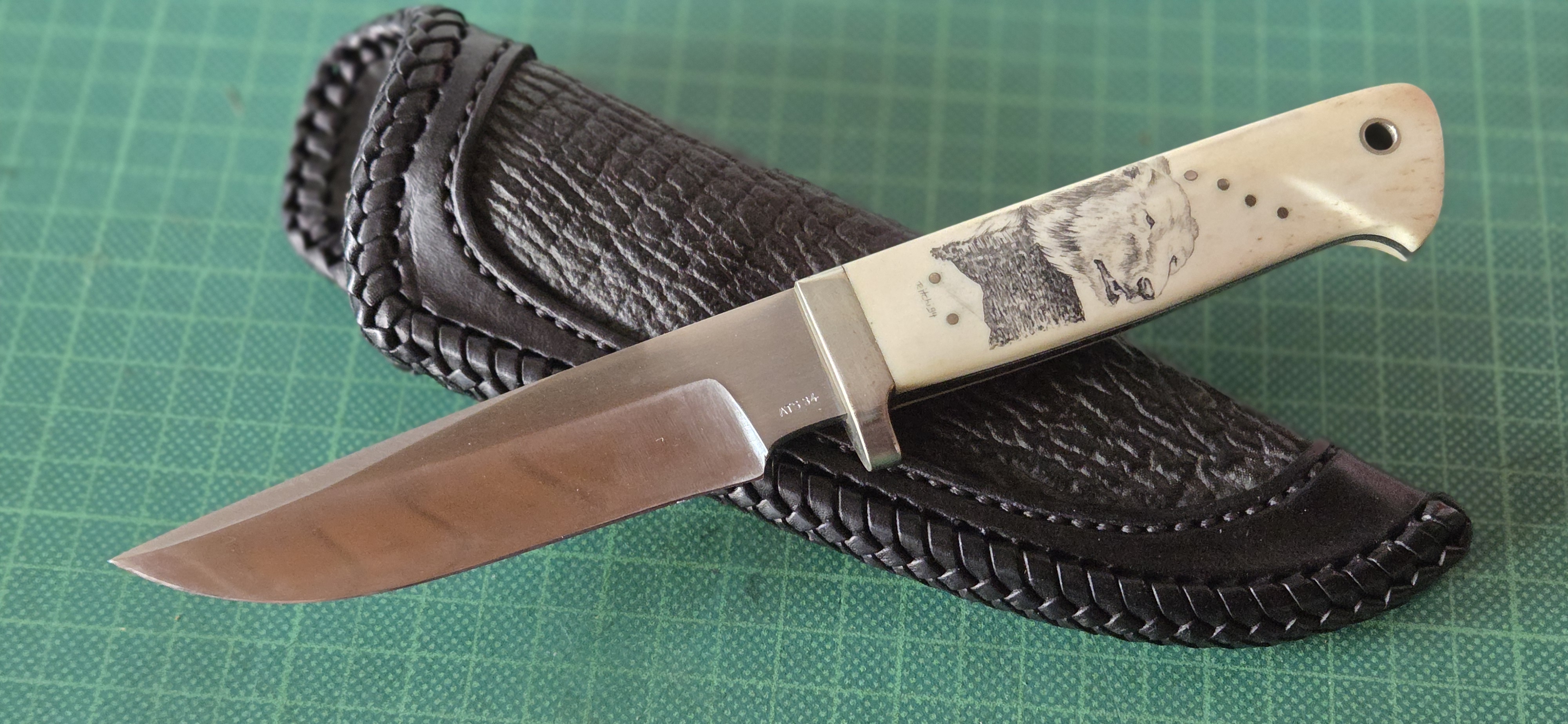 neuwertig, 154CM, spiegelpoliert, getapert, Edelstahlbacken, Mammutelfenbein mit Scrimshaw, schwarze Liner, Lederscheide, Klinge 11cm, Griff 12,4cm