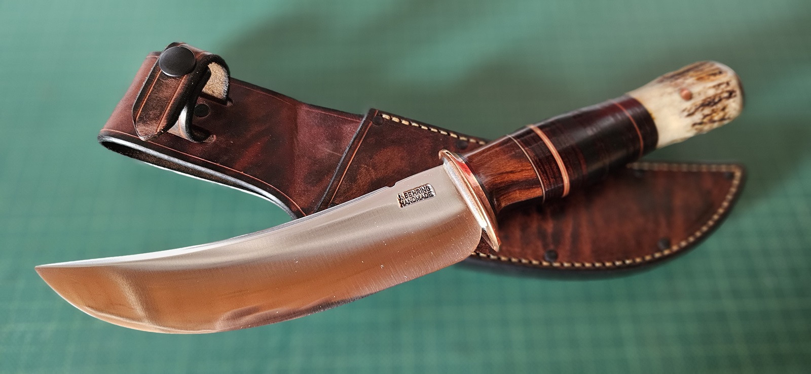 neuwertig, O1, poliert, Kupferguard, Wüsteneisenholz-Leder-Fiber-Horn, Lederscheide, Klinge 17cm, Griff 13,9cm