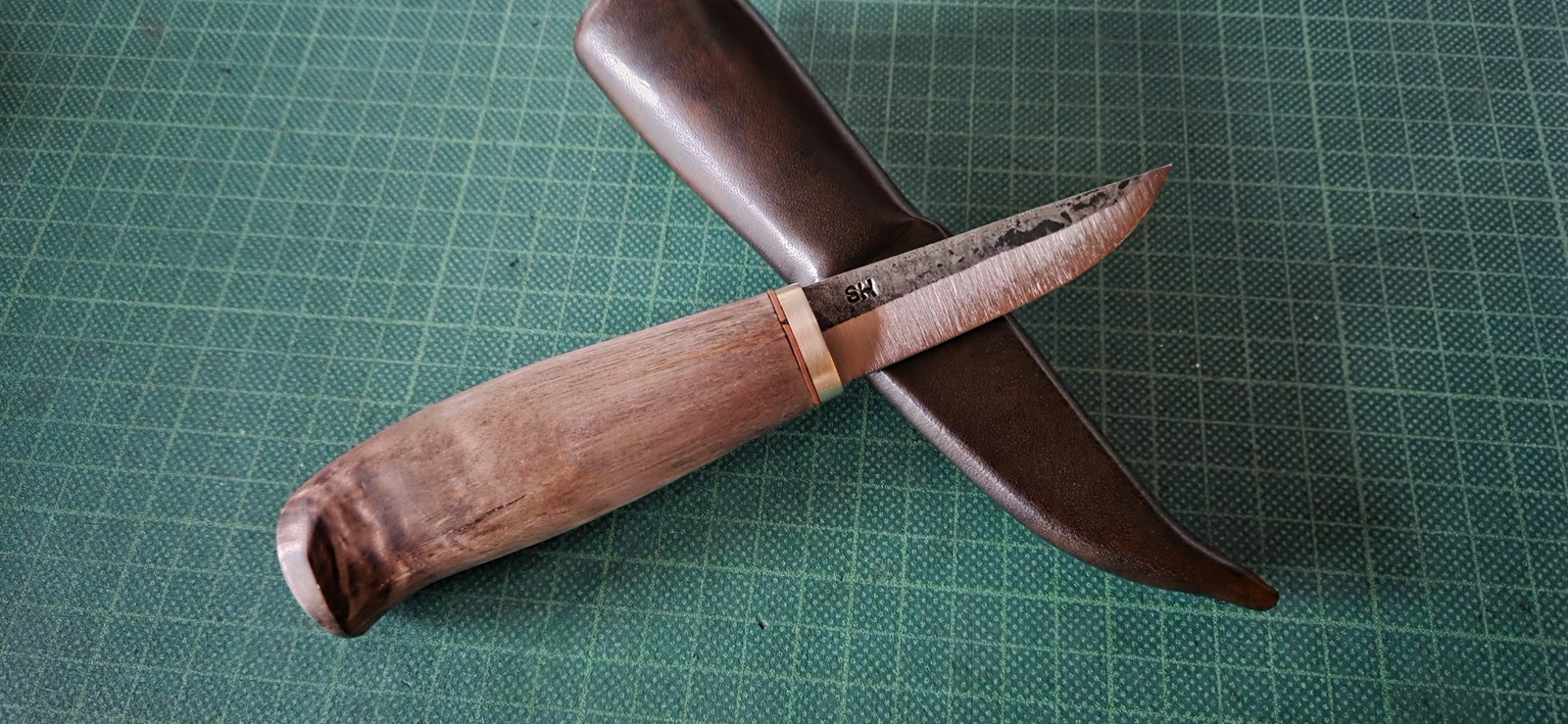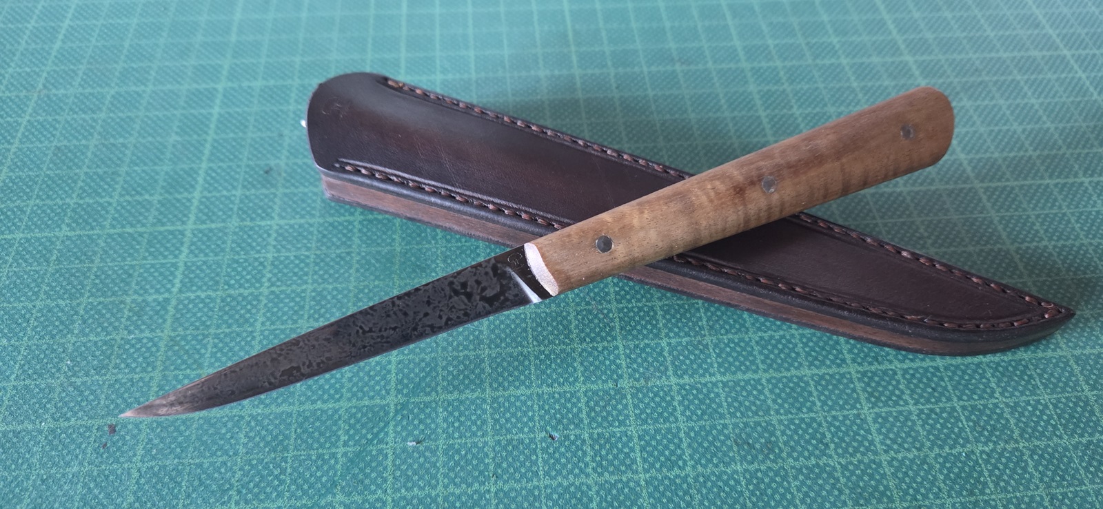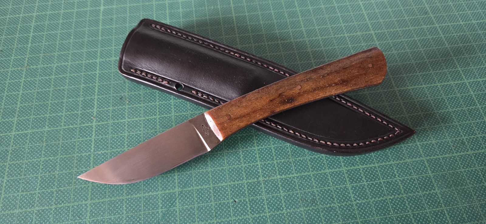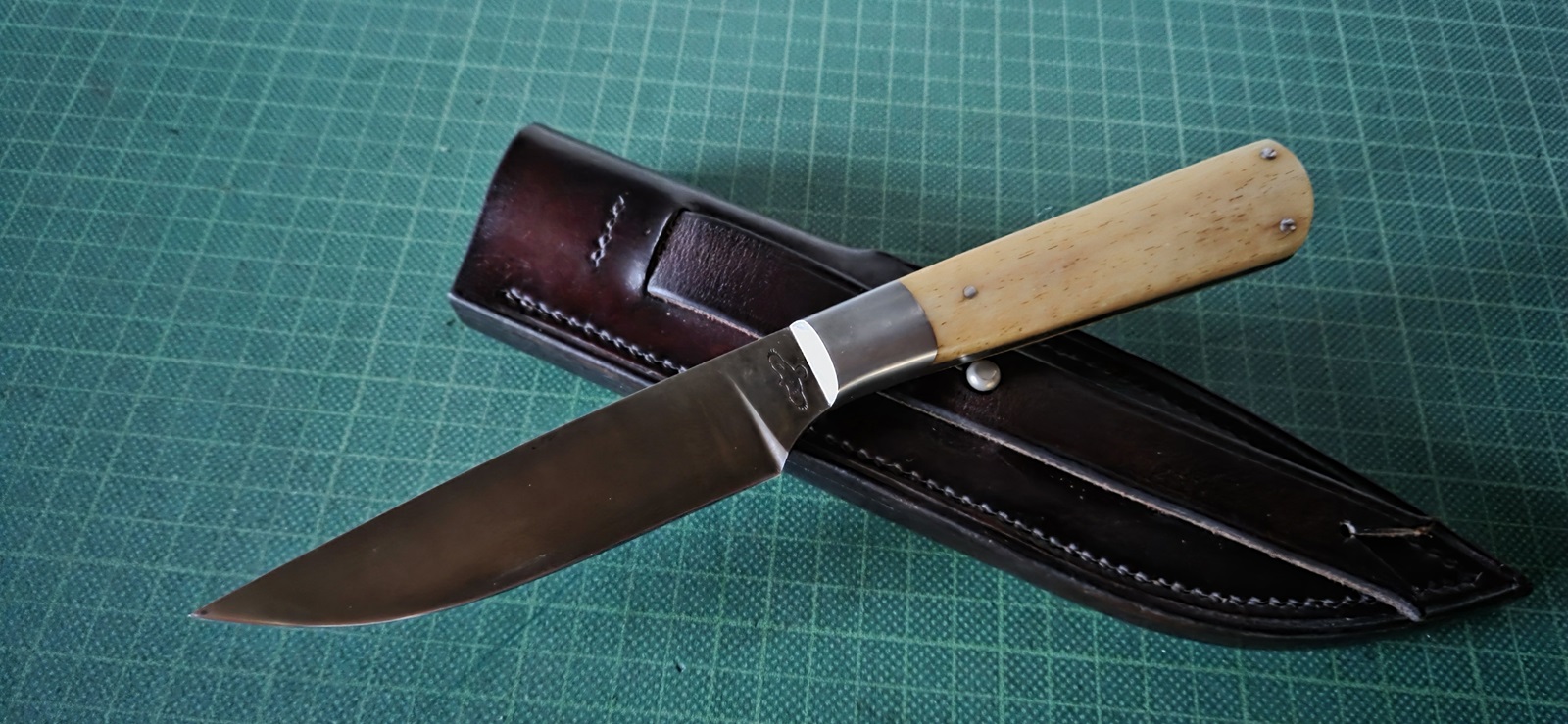 getragen, 115cv3, Stahlmonturen, Birkenrindengriff, Lederscheide, Klinge 8,7cm, Griff 10,1cm