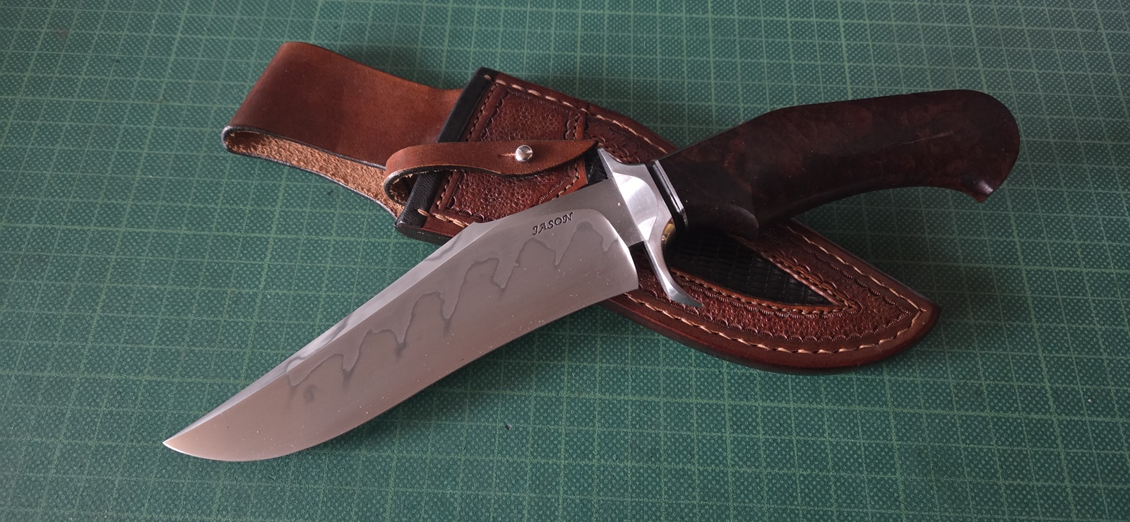 neuwertig, O1, Hamon, Edelstahlbacken, Wüsteneisenholz, Lederscheide, Klinge 15,3cm, Griff 11,4cm