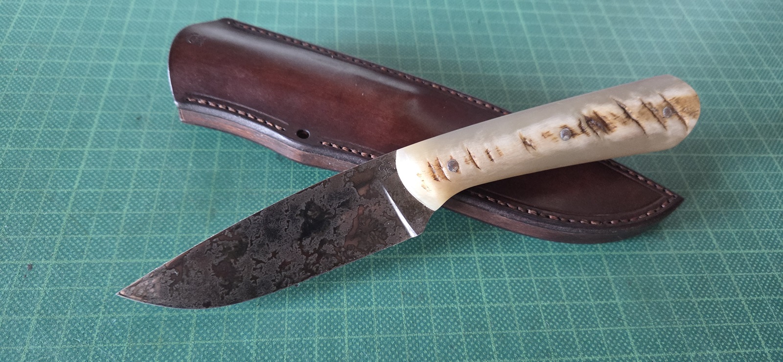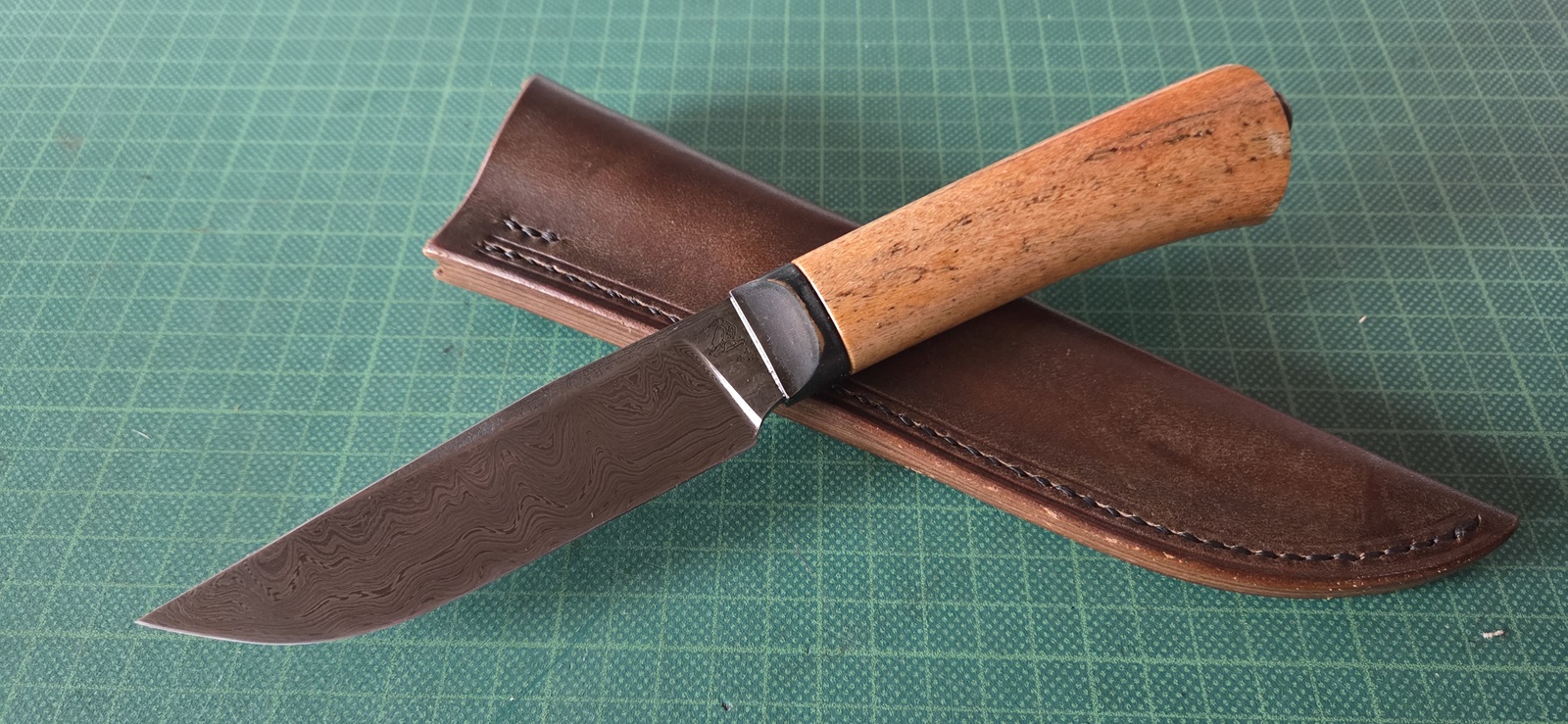 getragen, 80CrV2, stabilisierte gestockte Birke, Neusilber, Lederscheide, Klinge 7,6cm, Griff 11cm