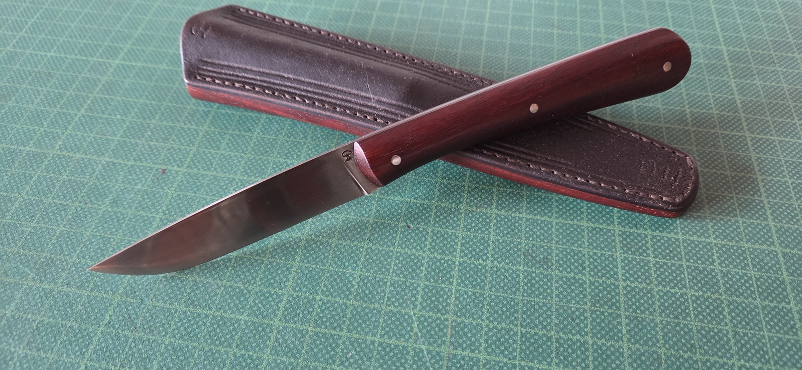 neuwertig, 1.2510, Padoukschalen, Rindslederscheide mit Padoukkeder, Klinge 8,6cm, Griff 11,8cm