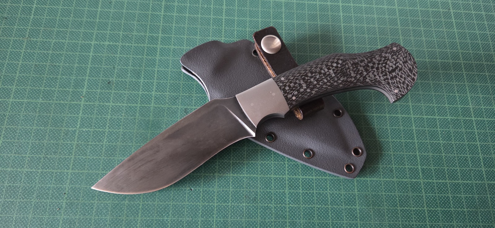 getragen, 1.2235, schwarz beschichtet, Titanbacken, Carbonschalen, Kydexscheide, Klinge 11,4cm, Griff 11,9cm