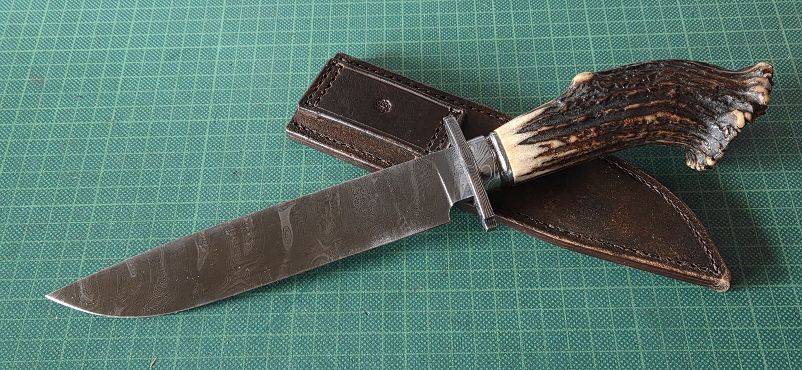 neuwertig, Damast vom Messerwerk, Horn, Lederscheide, Klinge 19,8cm, Griff 14,8cm
