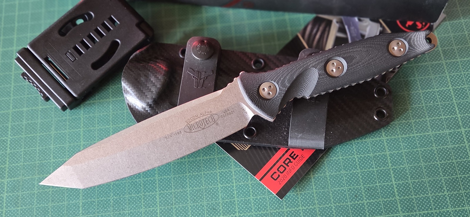 neuwertig in Box, M390, stonewashed, G10, verschraubt, Kydexscheide mit Tek-Lok, Klinge 13,6cm, Griff 12,9cm