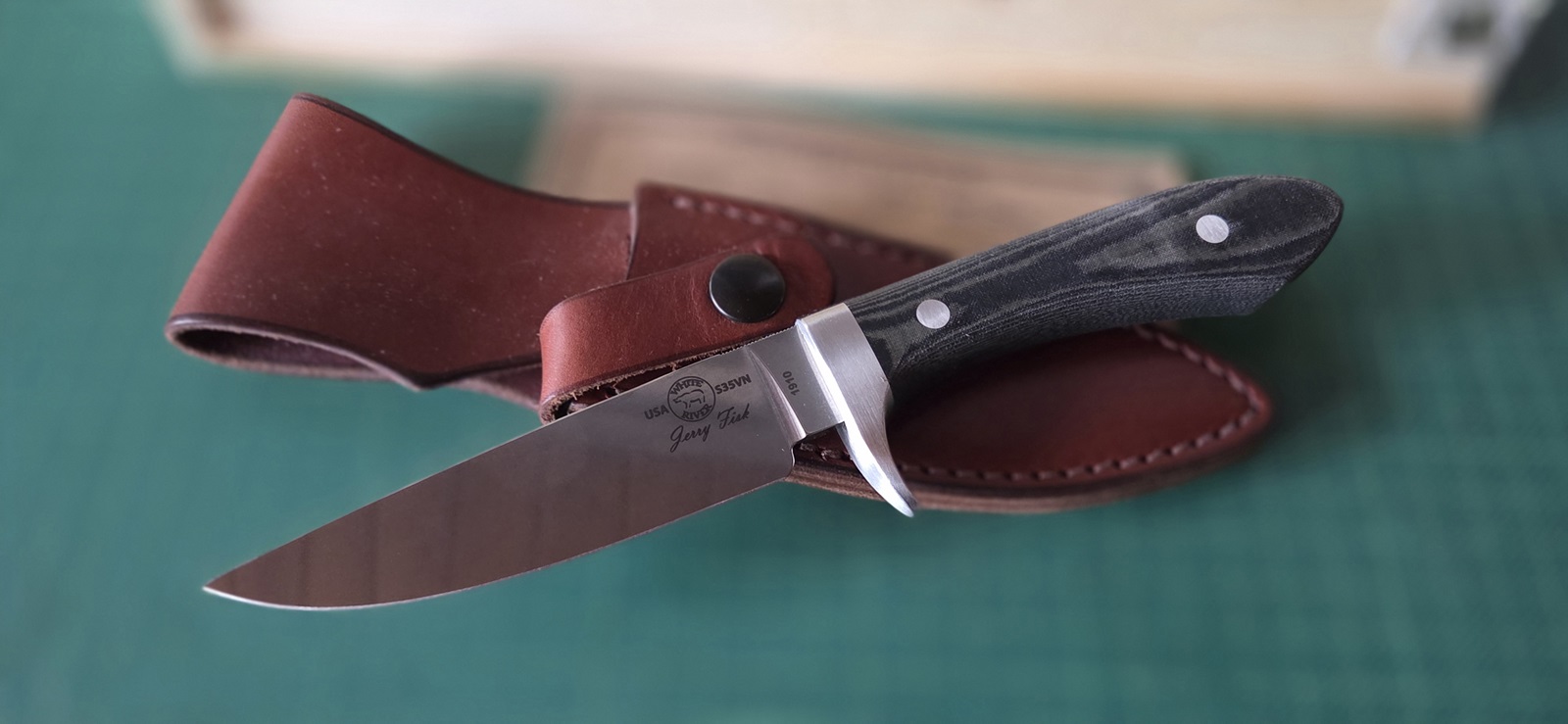neu in Box, S35VN, Edelstahlguard, schwarzes Leinenmicarta, Lederscheide, Klinge 11,7cm, Griff 11,3cm