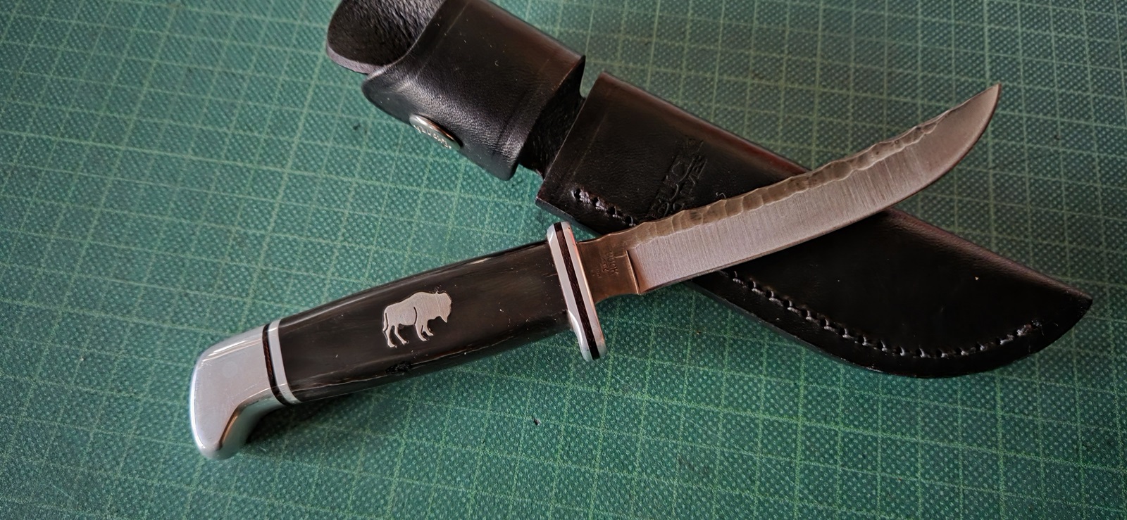 neuwertig, 440C, poliert, Edelstahlbacken, graviert, Horn, Lederscheide von Arno Buck, Klinge 8cm, Griff 10,8cm