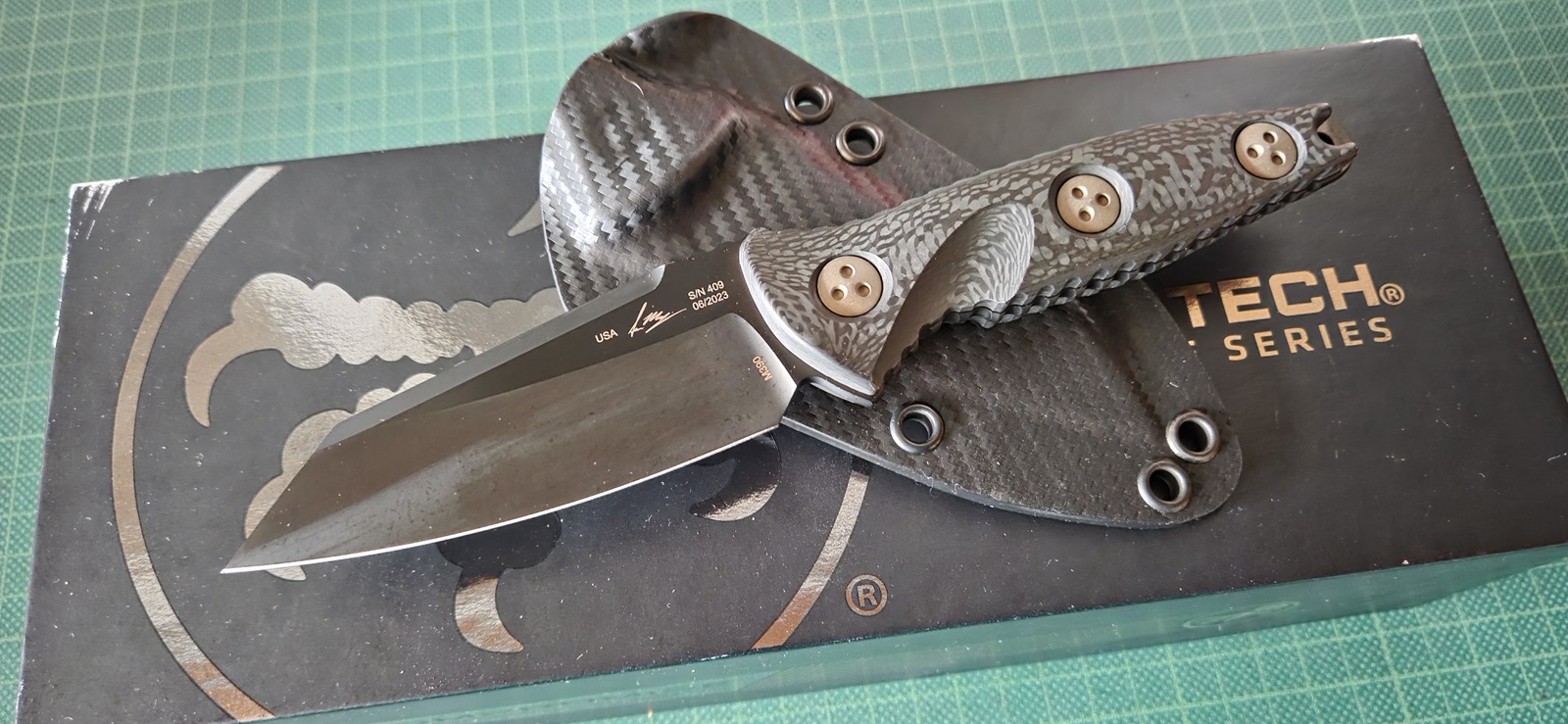 neuwertig in Box, M390, black, plain, Carbonschalen, Kydexscheide, Klinge 9,4cm, Griff 11,3cm