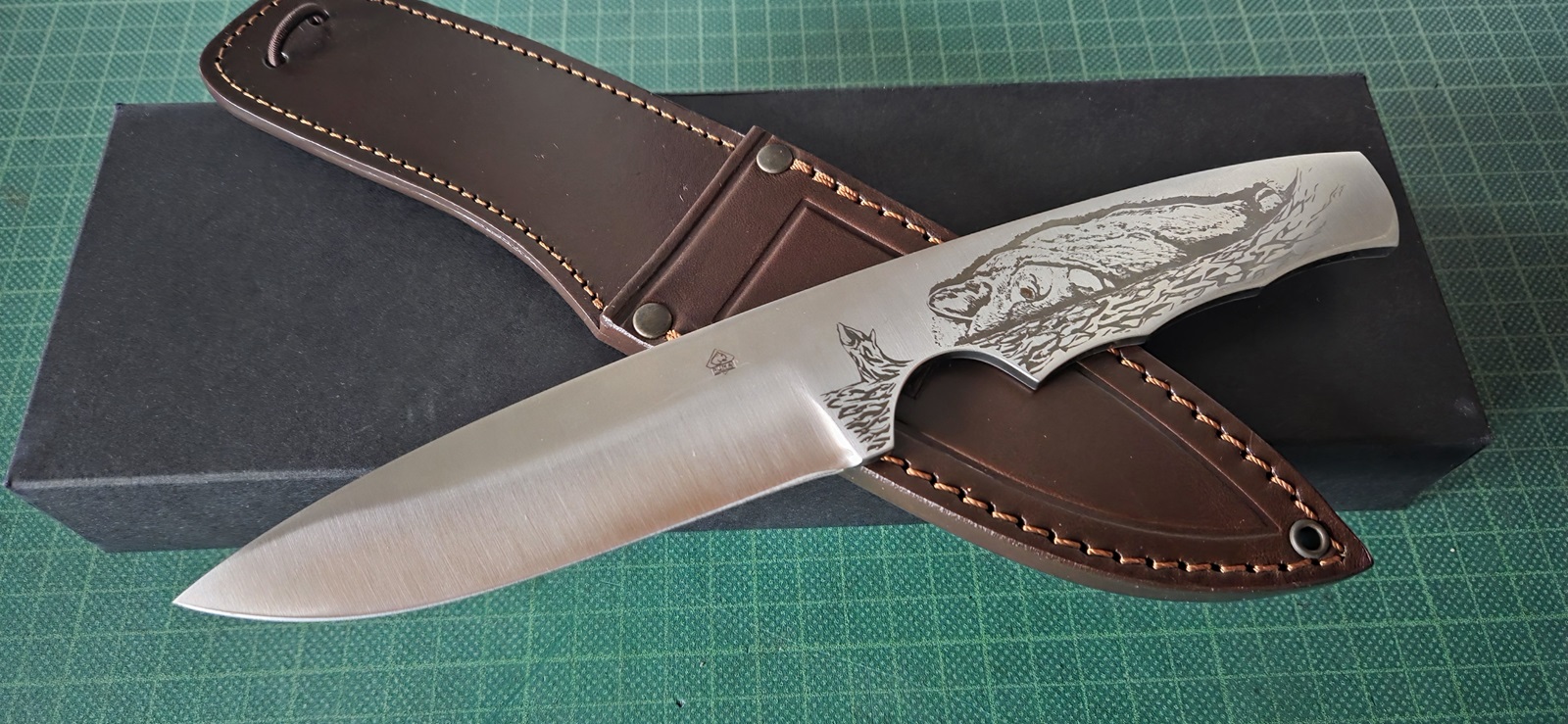 neu in Box, CPM154, schwarzes Leinenmicarta, Mosaikpins, Lederscheide, Klinge 9,8cm, Griff 11,6cm
