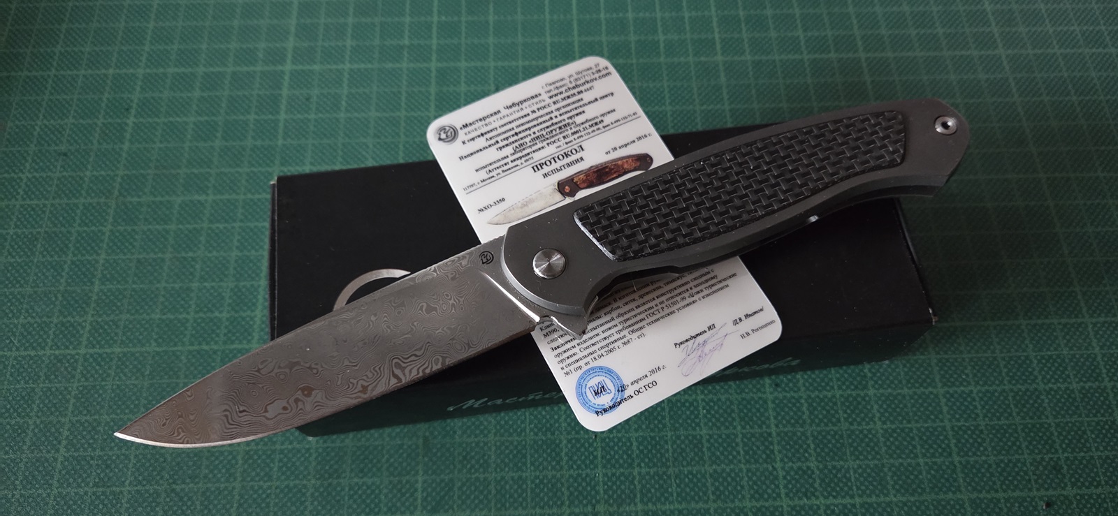 neuwertig, in Box, Damast, Titanframelock, Carboninlays, Clip, tip-up, Klinge 9,8cm, Griff 12,7cm