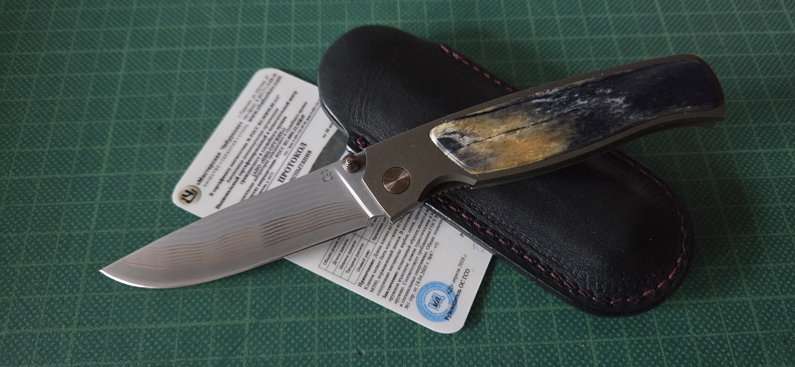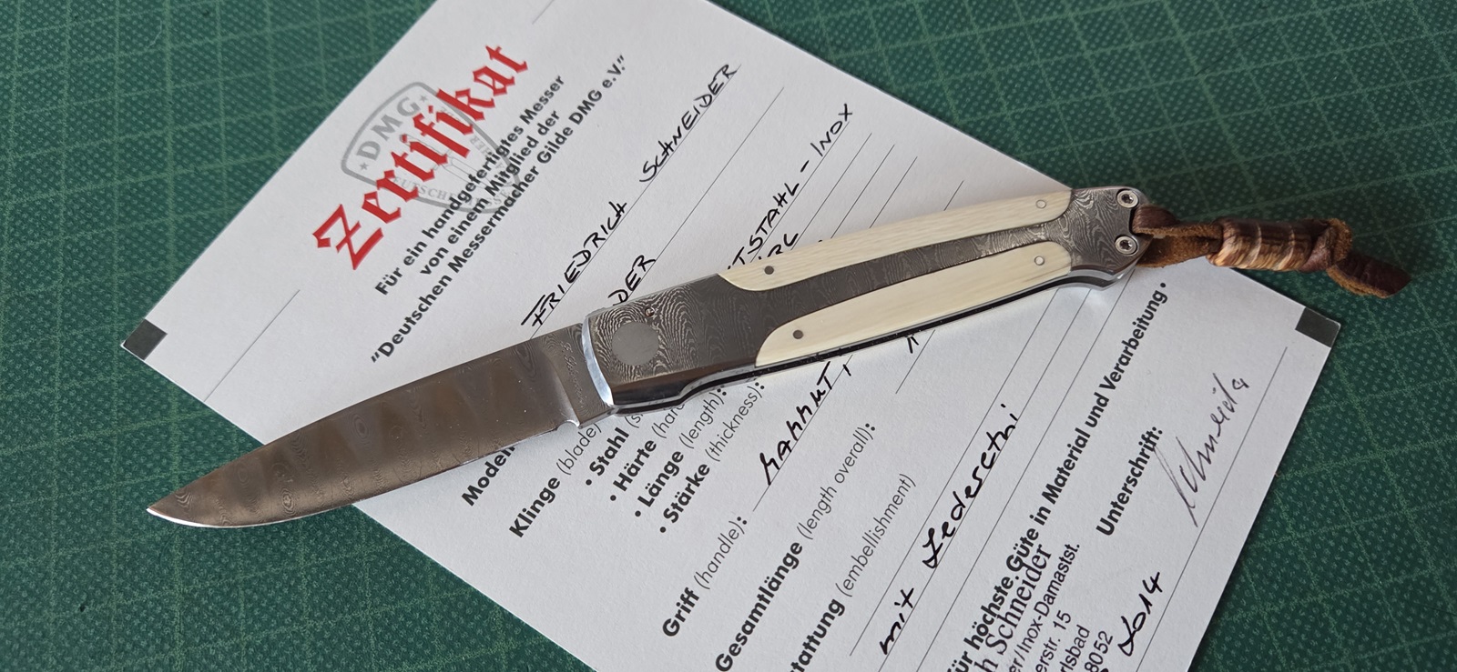 neuwertig, Damast, Damastbacken, Mammutschalen, Linerlock, Lederetui, Klinge 7,8cm, Griff 10,5cm