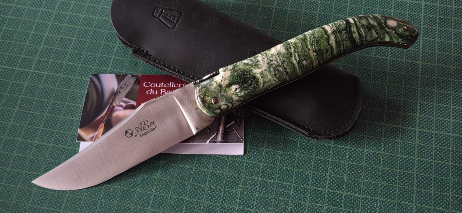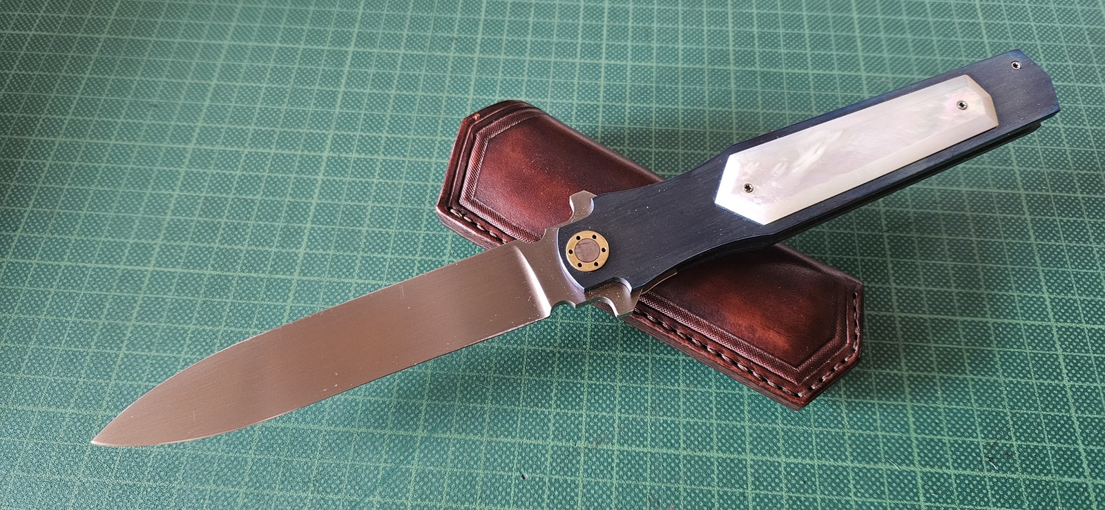 getragen, RWL, Linerlock, Titanschalen, Perlmutt, Lederetui, Klinge 13,9cm, Griff 15,7cm