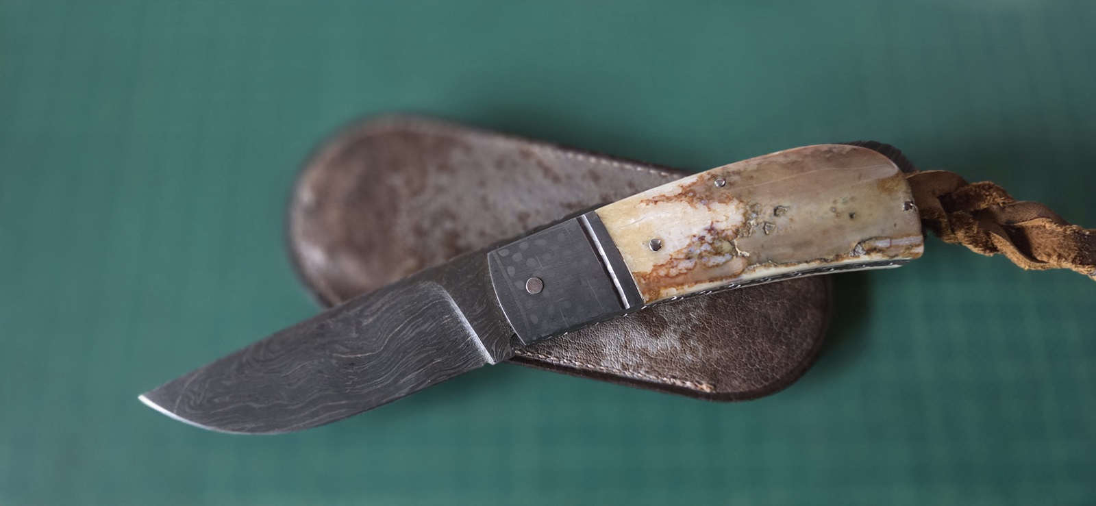 getragen, Damast, Damastbacken, Titanliner, Filework, Mammutschalen, Lederetui, Klinge 8,3cm, Griff 9,8cm