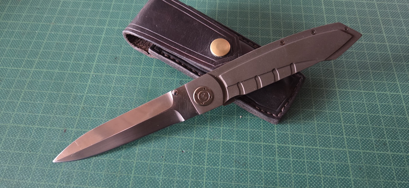 getragen, S35VN, Titanframelock, Clip, tip-up, Lederetui, Klinge 9,1cm, Griff 13,1cm