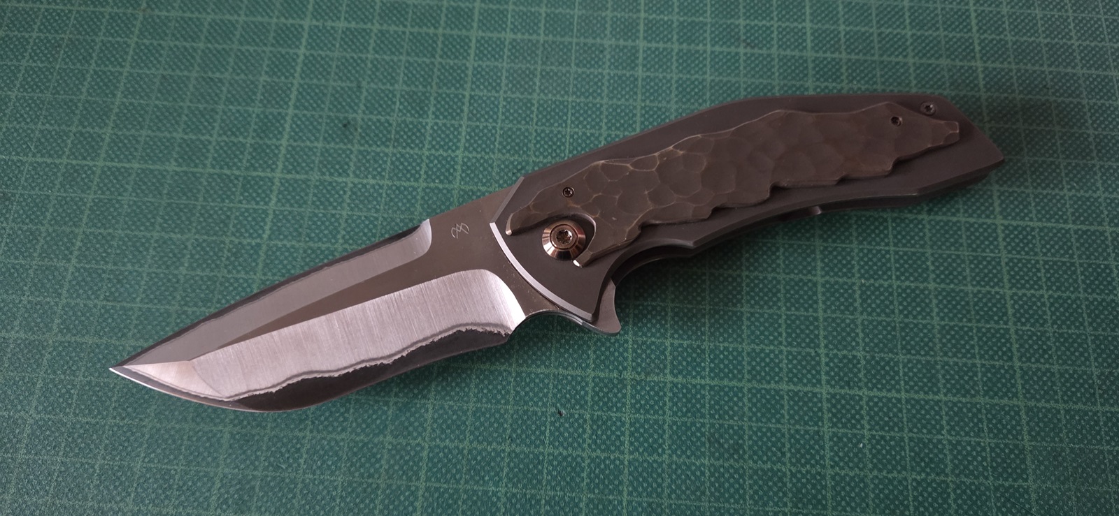 gebraucht, poliert, Titanschalen, Carboninlays, Linerlock, Clip, tip-down, Klinge 11,1cm, Griff 14,6cm