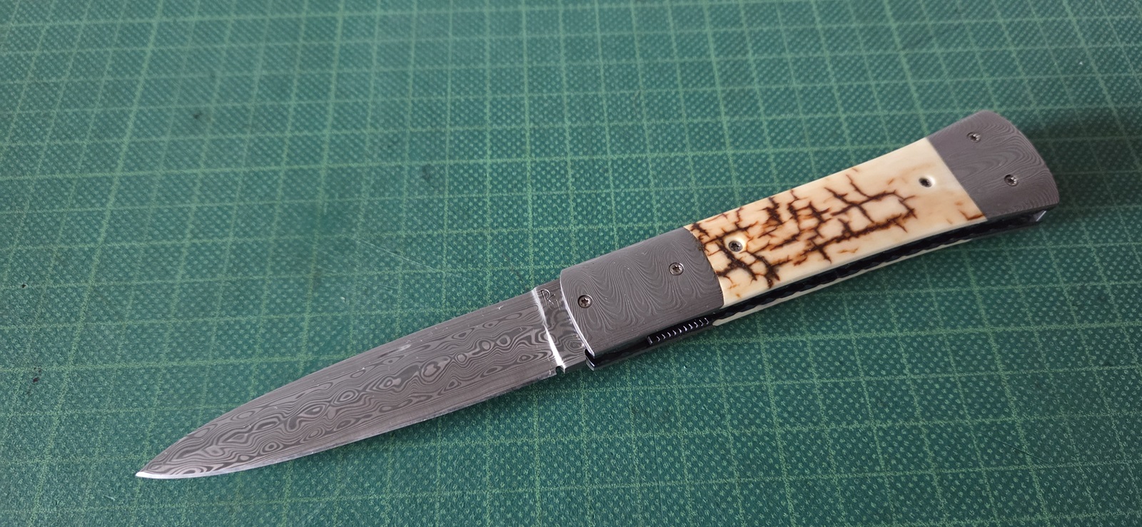 getragen, Jan Krauter Damast, Titanbacken, Giraffenknochen, Klinge 8,6cm, Griff 10,8cm