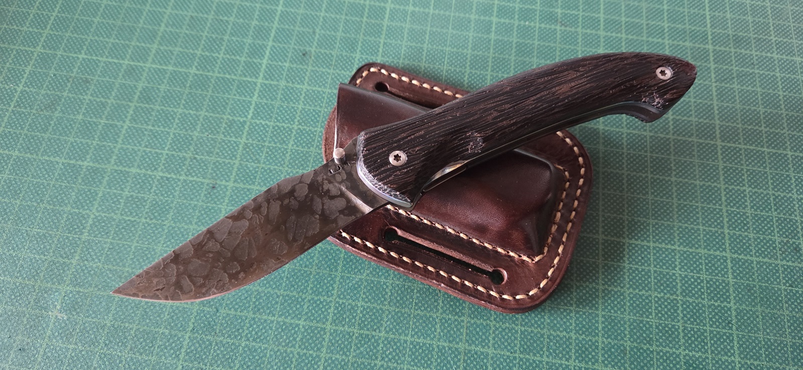 getragen, Papierstahl, brüniert, Mooreiche, Lederetui, Klinge 8,8cm, Griff 12,7cm