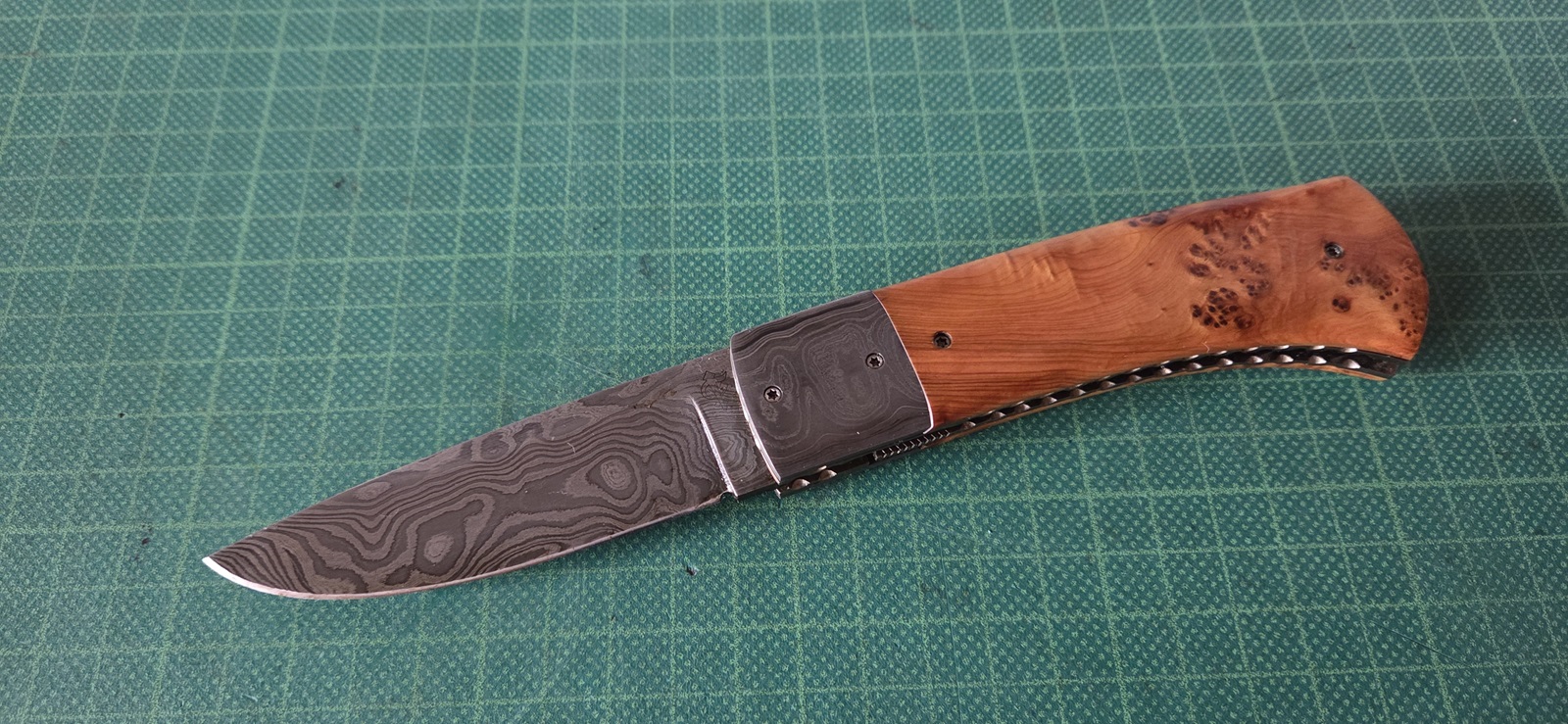 neuwertig, Damast, Damastbacken, Mammut, Linerlock, Klinge 9,1cm, Griff 11,2cm