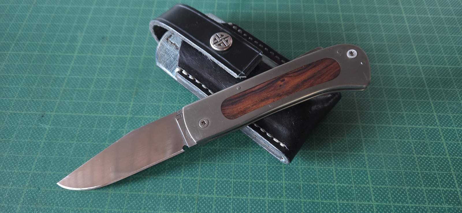 getragen, RWL, Titanrahmen, Wüsteneisenholz-Inlay, Lederetui, Klinge 8,3cm, Griff 10,9cm